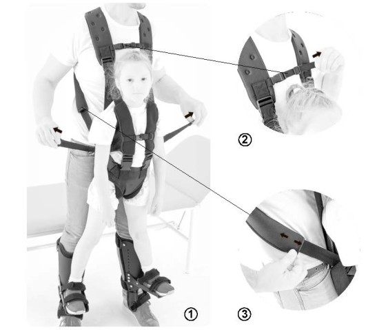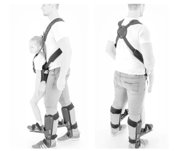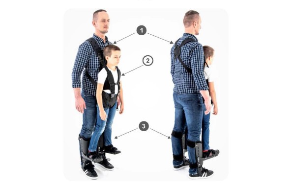 Изделие состоит из трех частей: жилета взрослого, бедренной детской повязки и накладок голени с платформами для стоп.