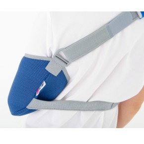 Ортез AM-SOB-03 это практичная поддержка плечевого и локтевого суставов, которая поддерживает согнутую в локте травмированную руку. Бандаж снабжен плечевой лентой, располагающейся на здоровой стороне тела, длина которой регулируется. Дополнительная обездвиживающая фиксация обеспечивается за счет поясного ремня, а также фиксации первого пальца, обеспечивающая дополнительную точку стабилизации конечности.