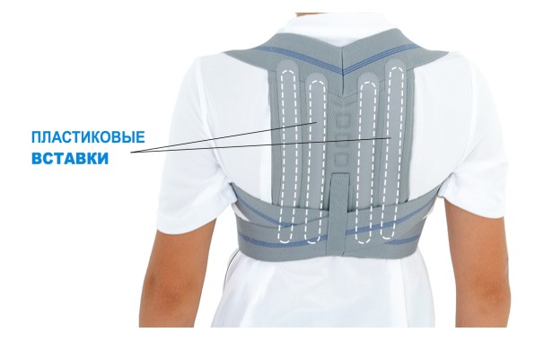 Спинная часть ортеза оборудована ортопедическими вставками, соединена с эластичными плечевыми лентами, которые проходят через плечо, скрещиваются в области поясничного отдела позвоночника и застегиваются на животе. Такая конструкция способствует формированию правильной осанки у детей.
