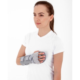 Сверху ладонь зафиксирована мягкой ладонной повязкой, прижимающей пальцы к стабилизатору. Ортез станет хорошей альтернативой тяжелому и неудобному в использовании гипсу.
