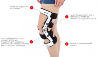 - Четыре точки фиксации защищают колено и уменьшают напряжение сустава. Точки приложения – рама на передней части бедра, передний ремень для голени, нижний бедренный ремень, задний большеберцовый ремень