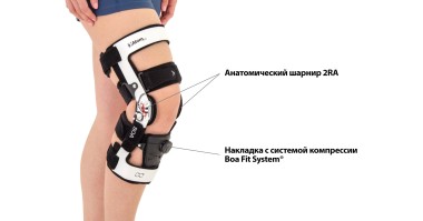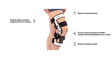 - Четыре точки фиксации защищают колено и уменьшают напряжение сустава. Точки приложения – рама на передней части бедра, передний ремень для голени, нижний бедренный ремень, задний большеберцовый ремень