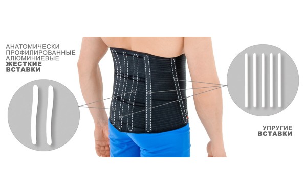 - В изделии используются специальные анатомически профилированные алюминиевые жесткие вставки и боковые ортопедические пластины для снятия напряжения в мышцах, связках и пояснично-крестцовых позвонках.