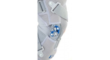 Третья точка опоры – диагональный динамический силовой ремень, который затягивается при растяжении колена. Ремень соединенный с полицентрическим шарниром, и 2 ремня над и под суставом (на мыщелках бедренной кости и большеберцовой кости) - данное решение снижает на 50% давление ремней на голень и бедро на противоположном участке. Ортез оснащен одной шиной 2ra Precision - это двухосные полицентрические шины, которые при изгибе точно отражают движение в коленном суставе, поэтому во время работы они не меняют свое положение относительно оси коленного сустава. Они оснащены шарниром, главным элементом которого являются направляющие, движущиеся по параболическим рельсам.