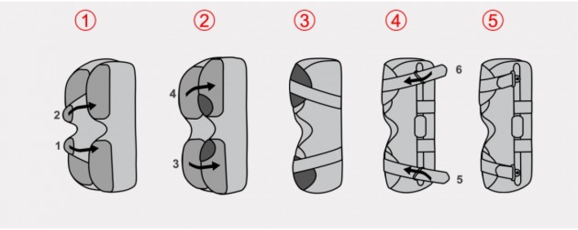 На концах шины есть две поворотные пряжки, через которые проходят динамические спиральные ремни, стабилизирующие коленный сустав и разгружающие поверхности сустава что уменьшает боль и предотвращает прогрессирование остеоартрита.