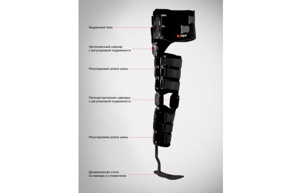 Ортез предназначен для пациентов, которые имеют проблемы со стабилизацией нижних конечностей и функционированием мышц. Ортез состоит из мягкого широкого тазобедренного пояса, мягких рукавов бедра и голени, пластиковых обойм, боковых ортопедических шин и стоподержателей из углеволокна. Стоподержатель предотвращает опущение стопы, правильно ее позиционирует, восстанавливает перекат стопы и сокращает патологические движения при ходьбе в вышележащих суставах. Композит из углеродного волокна накапливает и возвращает энергию, которая помогает пациенту при движении и снижает усталость.