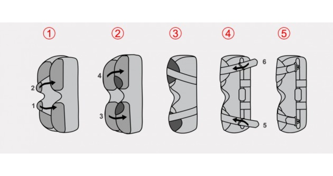 На концах шины есть две поворотные пряжки, через которые проходят динамические спиральные ремни, стабилизирующие коленный сустав и разгружающие поверхности сустава, что уменьшает боль и предотвращает прогрессирование остеоартрита.