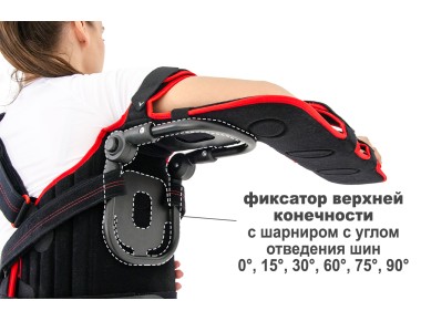 В качестве фиксатора верхней конечности применен инновационный шарнир с углом отведения шин 0°, 15°, 30°, 60°, 75°, 90°. Нужный угол устанавливается без каких-либо инструментов. Чтобы изменить угол нужно одновременно нажать две кнопки, что предохраняет от случайного изменения угла отведения.