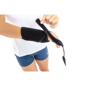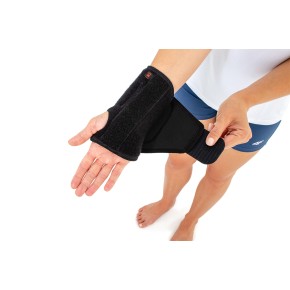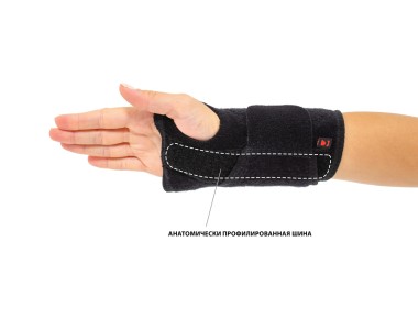 - Оснащен алюминиевой анатомически профилированной стальной шиной, которая предотвращает сгибание в ладони и идеально стабилизирует лучезапястный сустав.