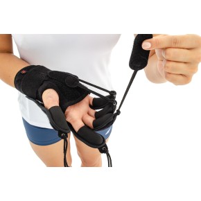 Ортез верхней конечности ОКГ-19 имеет 5 тяжей для пальцев. Это специальные кожухи с резинкой и застежкой-липучкой. Все тяжи независимые, что позволяет свободно использовать их даже в случае дегенеративных изменений. Резина, используемая в тягах, обеспечивает терапевтическое сопротивление, благодаря чему бандаж OKG-19 это не просто стабилизация, но и отличные медленные упражнения с сопротивлением для каждого из пальцев.