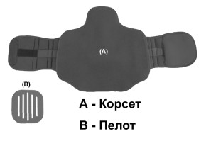 Корсет AM-WSP-12 состоит из двух независимых элементов анатомической формы. Благодаря этому ортез адаптируется к любой фигуре. В задней части корсета есть крепления для установки жесткого пояснично-крестцового пелота, а в передней части — карман для установки брюшного пелота. Ортез можно носить как с брюшным пелотом так и без него.