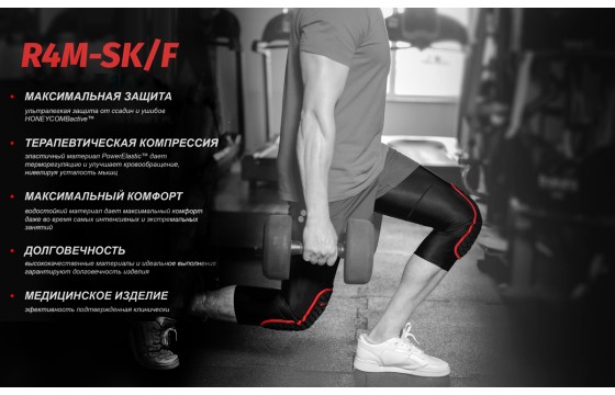 Ортез колена R4M- SK/F - профессиональное медицинское устройство, предназначенное для активных людей. Он защищает ткани коленного сустава и голени и обеспечивает комфортную терапевтическую компрессию. Изготовлен из удобного ультратонкого материала PowerElastic ™ и оснащен специальной термоформованной вставкой из сотовой пены под названием HONEYCOMBactive ™. Эта вставка защищает мягкие ткани и кости от травм в результате удара или падения.