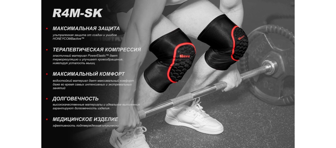 Ортез колена R4M- SK - профессиональное медицинское устройство, предназначенное для активных людей. Он защищает ткани коленного сустава и обеспечивает комфортную терапевтическую компрессию. Изготовлен из удобного ультратонкого материала PowerElastic ™ и оснащен специальной термоформованной вставкой из сотовой пены под названием HONEYCOMBactive ™. Эта вставка защищает мягкие ткани и кости от травм в результате удара или падения.