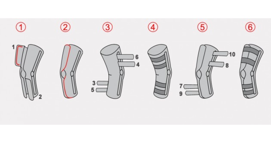 Ортез оснащен четырьмя независимыми наборами укрепляющих ремней, выполненных из лент VELCRO и двумя двухосными анатомическими боковыми шинами.