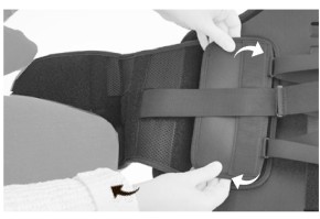 Также в задней части корсета находится система компрессии TapeLacing. С ее помощью, пользователь может регулировать уровень компрессии ортеза, силу воздействия на тело. Регулировка плавная, постепенная. Система работает при помощи металлических пряжек, ремней и застежек на липучках велкро. Широкий неэластичный ремешок по окружности является дополнительным стабилизирующим элементом, обеспечивающим регулируемую компрессию в пояснично-крестцовом отделе позвоночника.