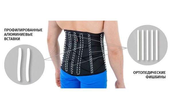 - В дополнении к шинам и ребрам корсет имеет специальные перекрещивающиеся сзади ленты. Ленты плотно прижимают шины к поясничному лордозу, усиливая разгрузочный эффект Шины поддерживают позвонки и мягкие ткани, такие как связки и мышцы